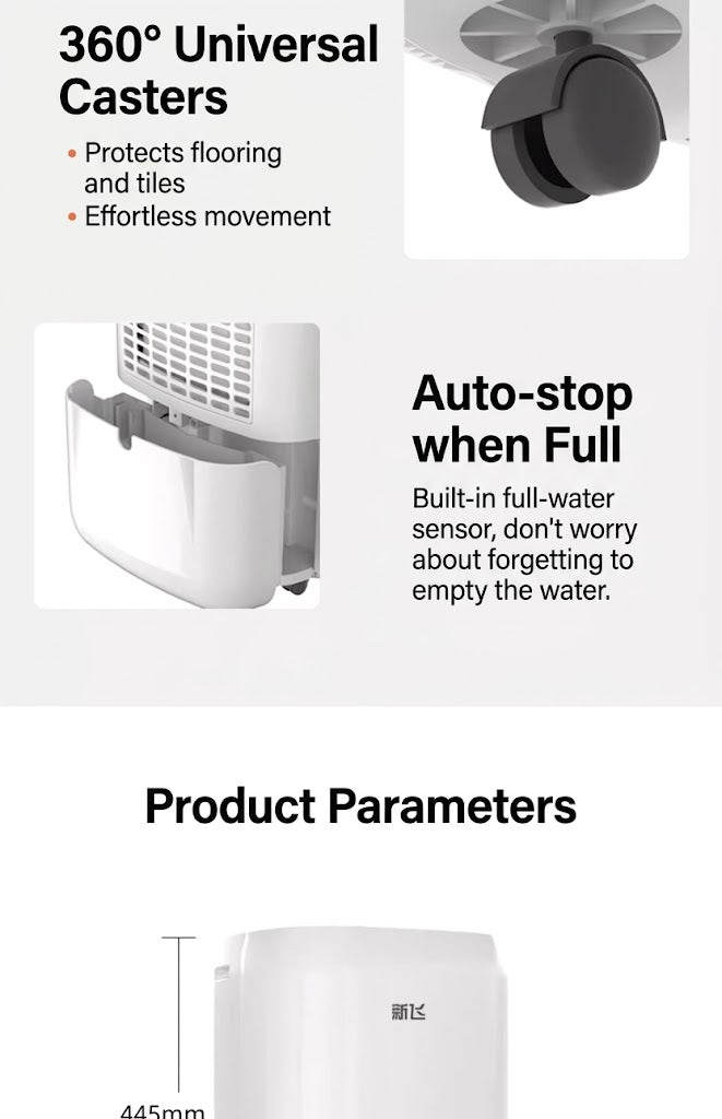 This dehumidifier is perfect option to remove moisture for your home, having highly efficient air volume of 195m3/h, up to 30L of moisture per day. Effectively solving excessive air humidity issues and preventing the generation of mould, fungus and bacteria. Enhance your surrounding air all the time.